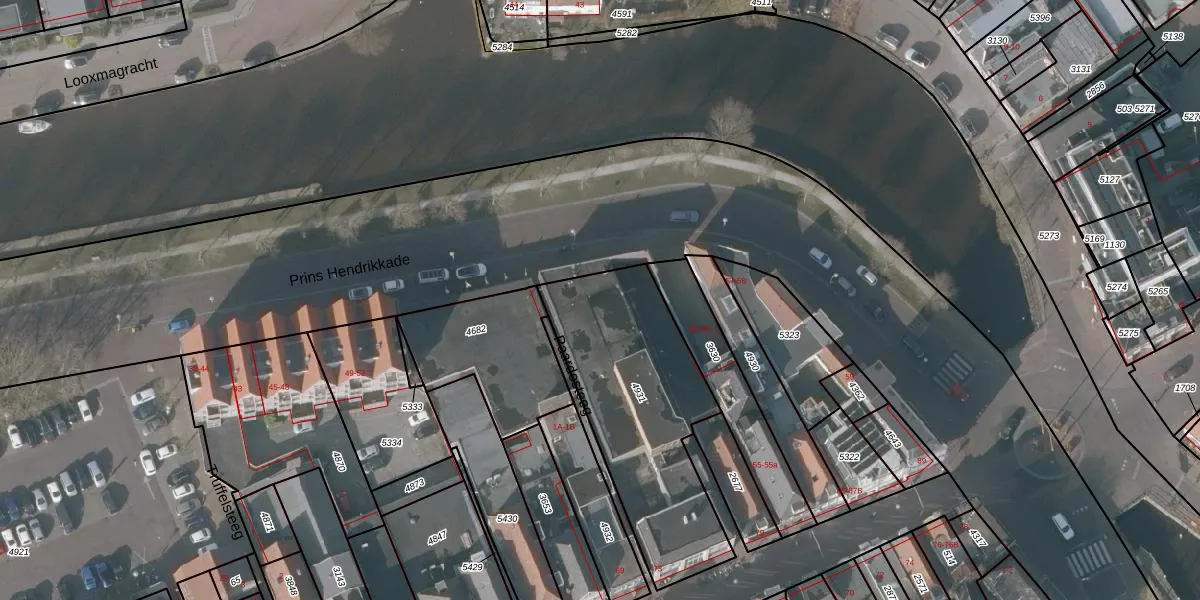 Prins Hendrikkade 54-102 is gelegen op kadastraal perceel SNE00B4931. Deze kadastrale aanduiding is uniek en wordt gebruikt door het Kadaster om eigendomsrechten en andere zakelijke rechten vast te leggen. Het perceel maakt onderdeel uit van de kadastrale gemeente Sneek.