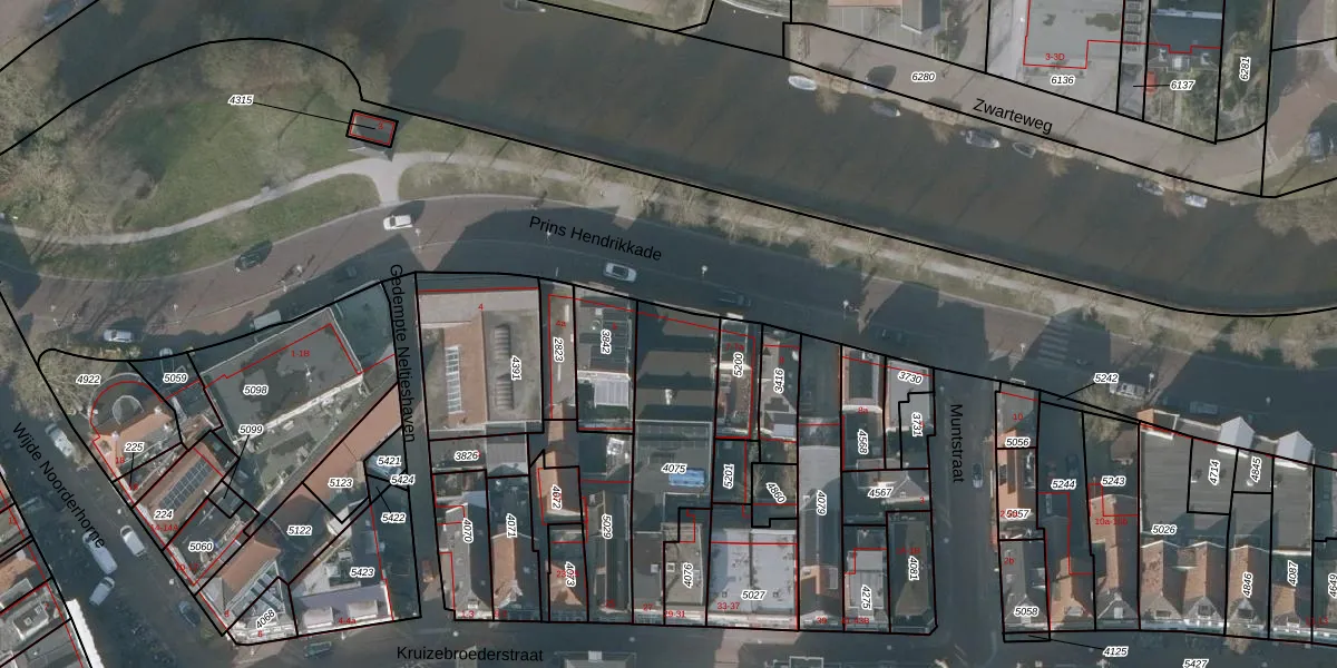 Het perceel waarop Prins Hendrikkade 6 staat heeft een oppervlakte van 428 m². Dit is een groot perceel. De perceeloppervlakte wordt geregistreerd door het Kadaster. Gedetailleerde informatie over de maten van dit perceel kunt u vinden in het rapport Kadastrale kaart met maatvoering van Prins Hendrikkade 6.