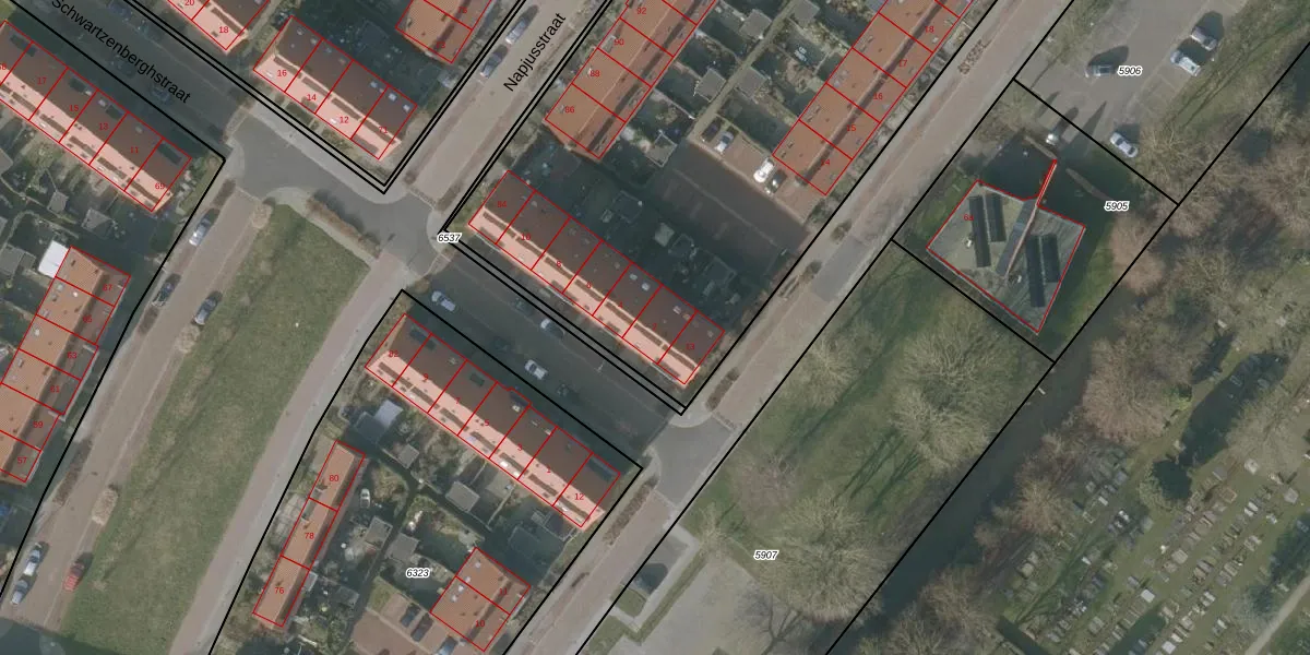 Het perceel waarop Schwartzenberghstraat 2 staat heeft een oppervlakte van 4803 m². Dit is een zeer groot perceel. De perceeloppervlakte wordt geregistreerd door het Kadaster. Gedetailleerde informatie over de maten van dit perceel kunt u vinden in het rapport Kadastrale kaart met maatvoering van Schwartzenberghstraat 2.