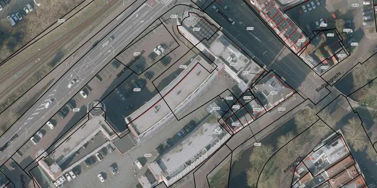 Het perceel waarop het adres ligt is SNE00-A-5955. De afkorting 'SNE00' staat voor kadastrale gemeente Sneek. Het perceel is kleiner dan gemiddeld in Sneek. Het perceel is 1143 m² groot, terwijl het gemiddelde ligt op 2095,04 m². De grootste perceeloppervlakte in de kadastrale gemeente is 61,3 ha. De kleinste oppervlakte bedraagt 0 m². Op het perceel zijn 17 adressen aanwezig. De huidige grenzen van het perceel zijn digitaal in de Basisregistratie Kadaster (BRK) geregistreerd op 19-01-2005.