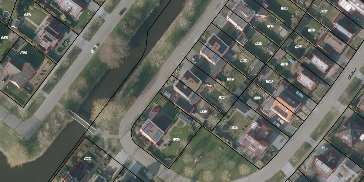 Slufter 34 is gelegen op kadastraal perceel SNE00E1957. Deze kadastrale aanduiding is uniek en wordt gebruikt door het Kadaster om eigendomsrechten en andere zakelijke rechten vast te leggen. Het perceel maakt onderdeel uit van de kadastrale gemeente Sneek.