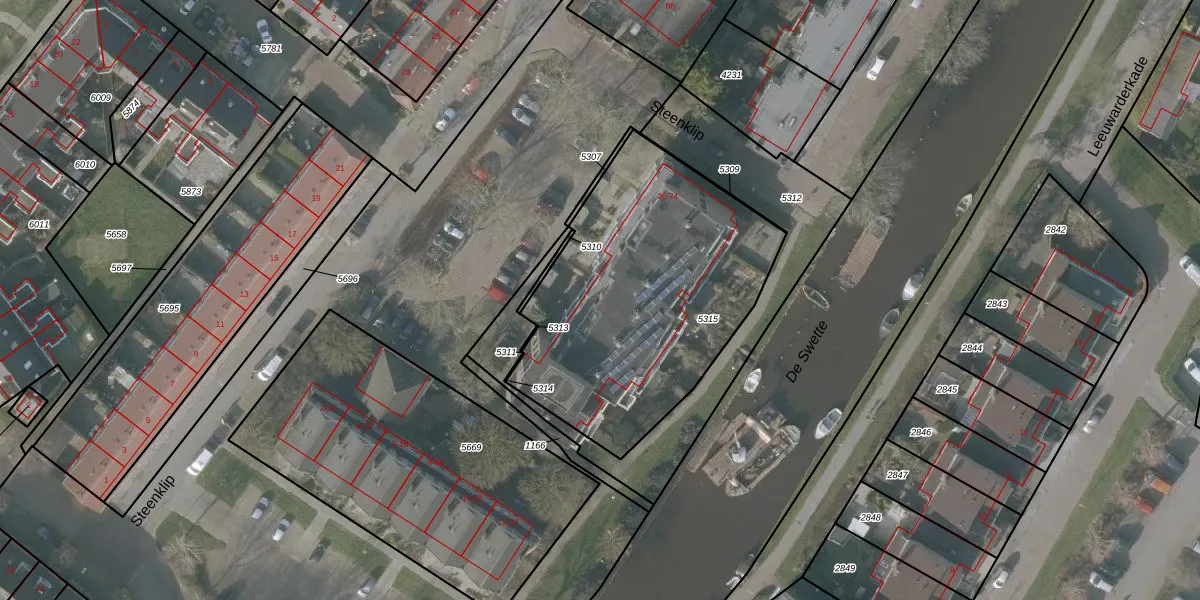 Het perceel waarop het adres ligt is SNE00-A-5315. De afkorting 'SNE00' staat voor kadastrale gemeente Sneek. De gemiddelde perceelgrootte in Sneek is 2093,37 m². Dit perceel is kleiner: de perceeloppervlakte bedraagt 1389 m². Het grootste perceel in de kadastrale gemeente is 61,3 ha. Het kleinste perceel heeft een oppervlakte van 0 m². Er zijn 25 adressen aanwezig op het perceel. De huidige grenzen van het perceel zijn digitaal in de Basisregistratie Kadaster (BRK) geregistreerd op 15-01-1998.