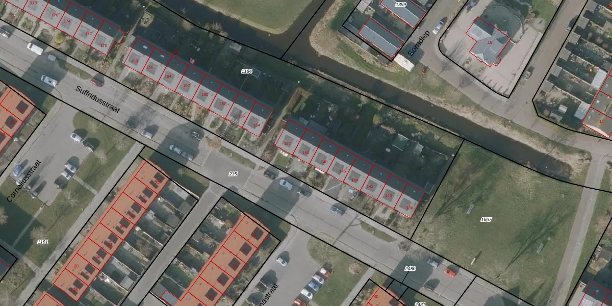 Suffridusstraat 150 is gelegen op kadastraal perceel SNE00E1184. Deze kadastrale aanduiding is uniek en wordt gebruikt door het Kadaster om eigendomsrechten en andere zakelijke rechten vast te leggen. Het perceel maakt onderdeel uit van de kadastrale gemeente Sneek.