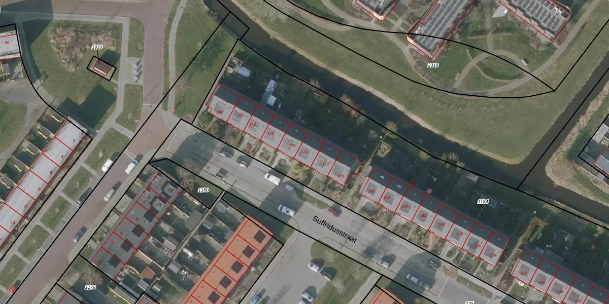 Suffridusstraat 174 is gelegen op kadastraal perceel SNE00E1184. Deze kadastrale aanduiding is uniek en wordt gebruikt door het Kadaster om eigendomsrechten en andere zakelijke rechten vast te leggen. Het perceel maakt onderdeel uit van de kadastrale gemeente Sneek.
