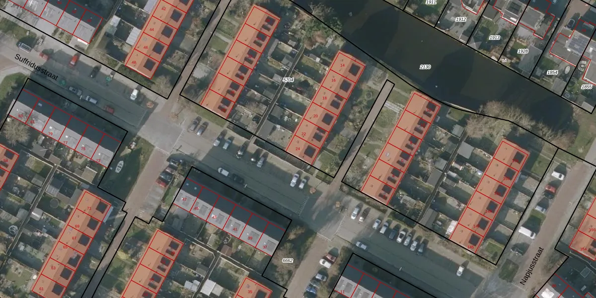 Suffridusstraat 24 is gelegen op kadastraal perceel SNE00A5704. Deze kadastrale aanduiding is uniek en wordt gebruikt door het Kadaster om eigendomsrechten en andere zakelijke rechten vast te leggen. Het perceel maakt onderdeel uit van de kadastrale gemeente Sneek.