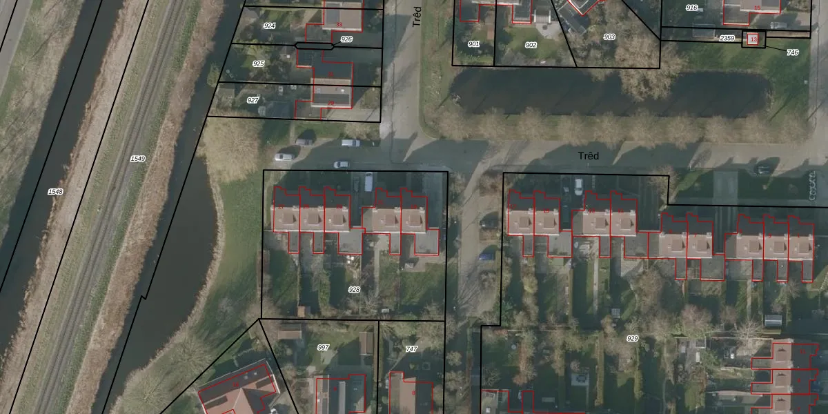 Het perceel waarop Trêd 19 staat heeft een oppervlakte van 1600 m². Dit is een zeer groot perceel. De perceeloppervlakte wordt geregistreerd door het Kadaster. Gedetailleerde informatie over de maten van dit perceel kunt u vinden in het rapport Kadastrale kaart met maatvoering van Trêd 19.