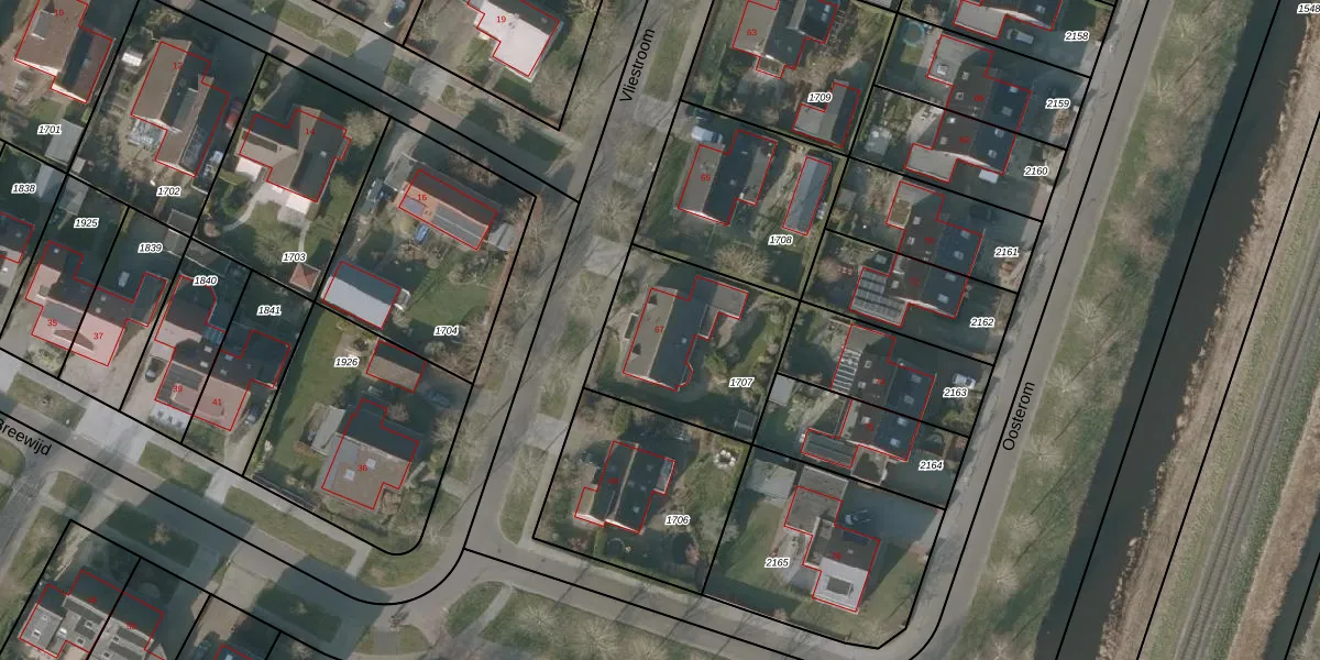 Het perceel waarop Vliestroom 67 staat heeft een oppervlakte van 621 m². Dit is een groot perceel. De perceeloppervlakte wordt geregistreerd door het Kadaster. Gedetailleerde informatie over de maten van dit perceel kunt u vinden in het rapport Kadastrale kaart met maatvoering van Vliestroom 67.