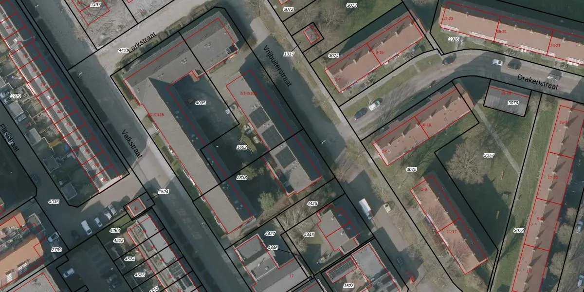 Het perceel waarop Vrijbuiterstraat 2-105 staat heeft een oppervlakte van 907 m². Dit is een groot perceel. De perceeloppervlakte wordt geregistreerd door het Kadaster. Gedetailleerde informatie over de maten van dit perceel kunt u vinden in het rapport Kadastrale kaart met maatvoering van Vrijbuiterstraat 2-105.