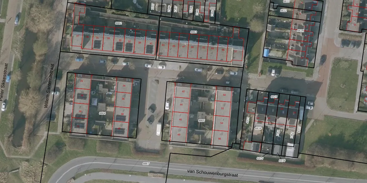 Willem Santemastraat 42 is gelegen op kadastraal perceel SNE00C8865. Deze kadastrale aanduiding is uniek en wordt gebruikt door het Kadaster om eigendomsrechten en andere zakelijke rechten vast te leggen. Het perceel maakt onderdeel uit van de kadastrale gemeente Sneek.