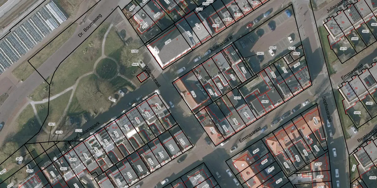 Het perceel waarop Willemstraat 28 staat heeft een oppervlakte van 249 m². Dit is een middelgroot perceel. De perceeloppervlakte wordt geregistreerd door het Kadaster. Gedetailleerde informatie over de maten van dit perceel kunt u vinden in het rapport Kadastrale kaart met maatvoering van Willemstraat 28.