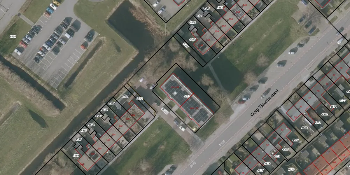 Worp Tjaardastraat 174 is gelegen op kadastraal perceel SNE00A5717. Deze kadastrale aanduiding is uniek en wordt gebruikt door het Kadaster om eigendomsrechten en andere zakelijke rechten vast te leggen. Het perceel maakt onderdeel uit van de kadastrale gemeente Sneek.