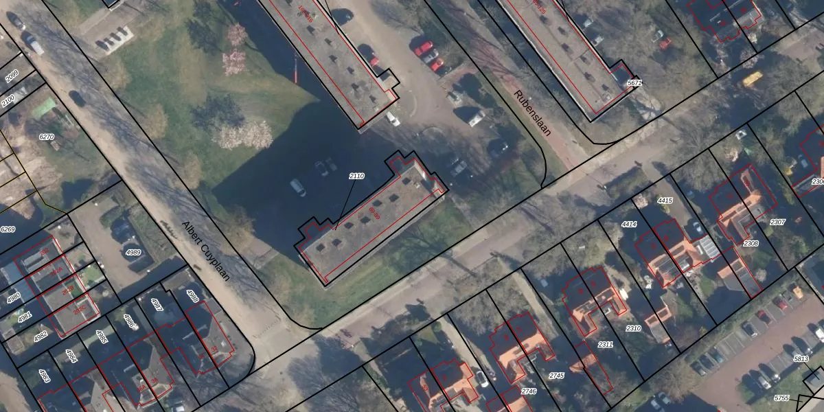 Het perceel waarop Albert Cuyplaan 99 staat heeft een oppervlakte van 460 m². Dit is een groot perceel. De perceeloppervlakte wordt geregistreerd door het Kadaster. Gedetailleerde informatie over de maten van dit perceel kunt u vinden in het rapport Kadastrale kaart met maatvoering van Albert Cuyplaan 99.