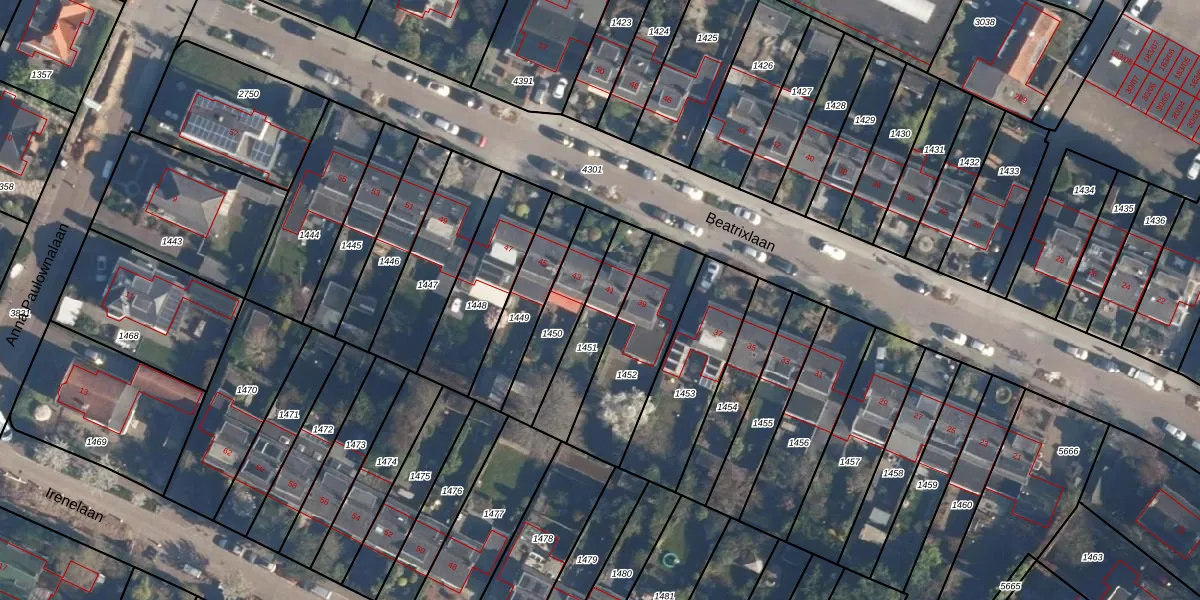 Beatrixlaan 41 is gelegen op kadastraal perceel SOE00K1451. Deze kadastrale aanduiding is uniek en wordt gebruikt door het Kadaster om eigendomsrechten en andere zakelijke rechten vast te leggen. Het perceel maakt onderdeel uit van de kadastrale gemeente Soest.
