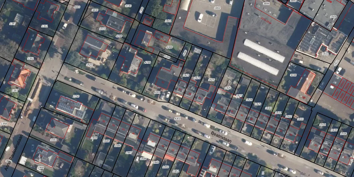 Beatrixlaan 50 is gelegen op kadastraal perceel SOE00K1423. Deze kadastrale aanduiding is uniek en wordt gebruikt door het Kadaster om eigendomsrechten en andere zakelijke rechten vast te leggen. Het perceel maakt onderdeel uit van de kadastrale gemeente Soest.