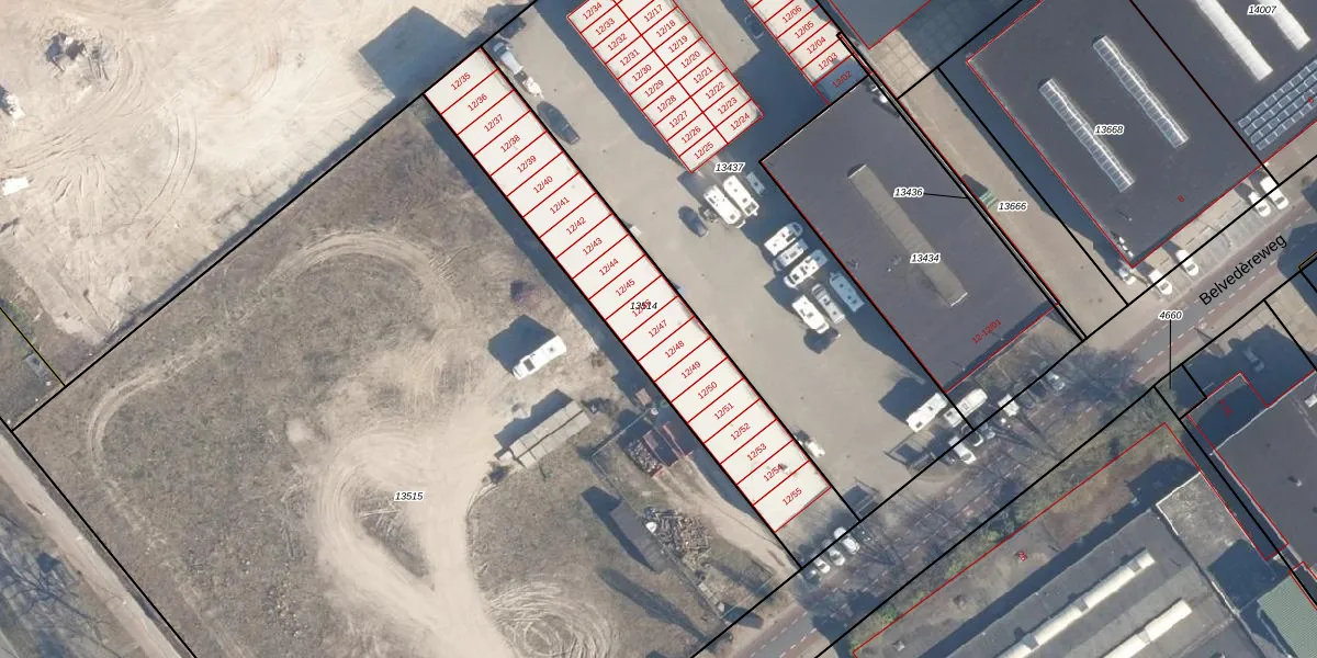 Belvedèreweg 12-47 is gelegen op kadastraal perceel SOE00G13514. Deze kadastrale aanduiding is uniek en wordt gebruikt door het Kadaster om eigendomsrechten en andere zakelijke rechten vast te leggen. Het perceel maakt onderdeel uit van de kadastrale gemeente Soest.