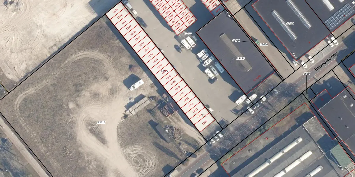 Belvedèreweg 12-49 is gelegen op kadastraal perceel SOE00G13514. Deze kadastrale aanduiding is uniek en wordt gebruikt door het Kadaster om eigendomsrechten en andere zakelijke rechten vast te leggen. Het perceel maakt onderdeel uit van de kadastrale gemeente Soest.