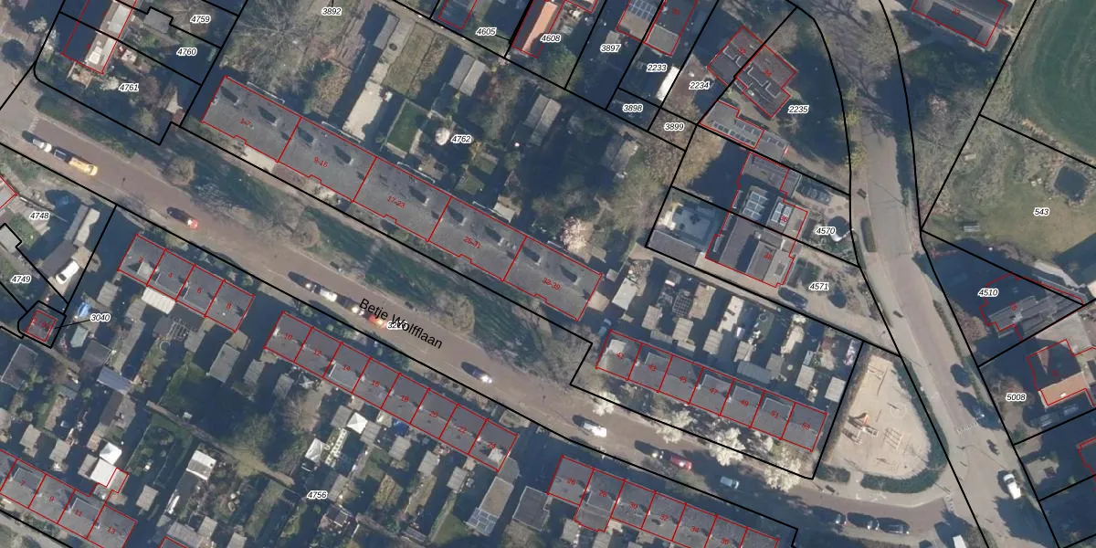 Betje Wolfflaan 39 is gelegen op kadastraal perceel SOE00C4762. Deze kadastrale aanduiding is uniek en wordt gebruikt door het Kadaster om eigendomsrechten en andere zakelijke rechten vast te leggen. Het perceel maakt onderdeel uit van de kadastrale gemeente Soest.