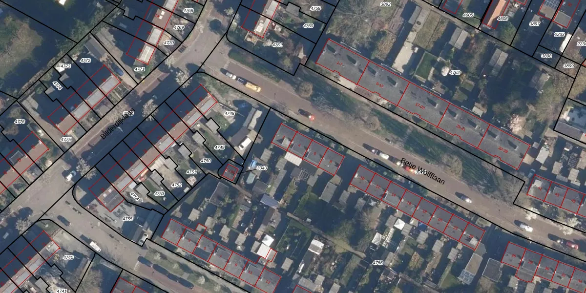 Betje Wolfflaan 4 is gelegen op kadastraal perceel SOE00C4756. Deze kadastrale aanduiding is uniek en wordt gebruikt door het Kadaster om eigendomsrechten en andere zakelijke rechten vast te leggen. Het perceel maakt onderdeel uit van de kadastrale gemeente Soest.