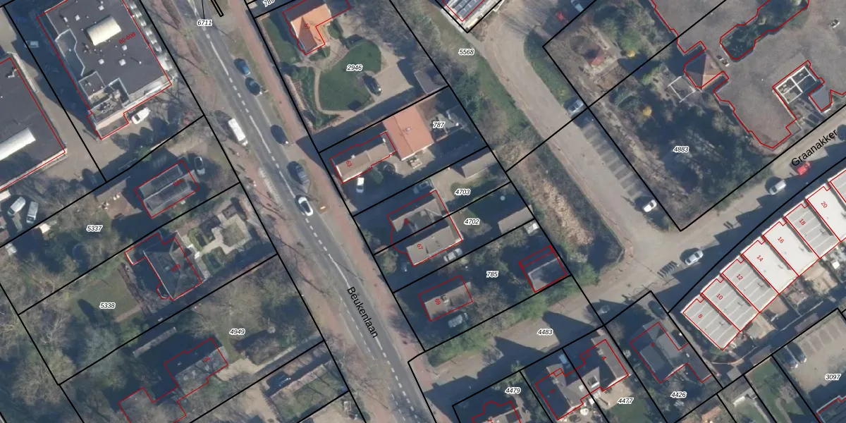 Beukenlaan 65 is gelegen op kadastraal perceel SOE00K4703. Deze kadastrale aanduiding is uniek en wordt gebruikt door het Kadaster om eigendomsrechten en andere zakelijke rechten vast te leggen. Het perceel maakt onderdeel uit van de kadastrale gemeente Soest.