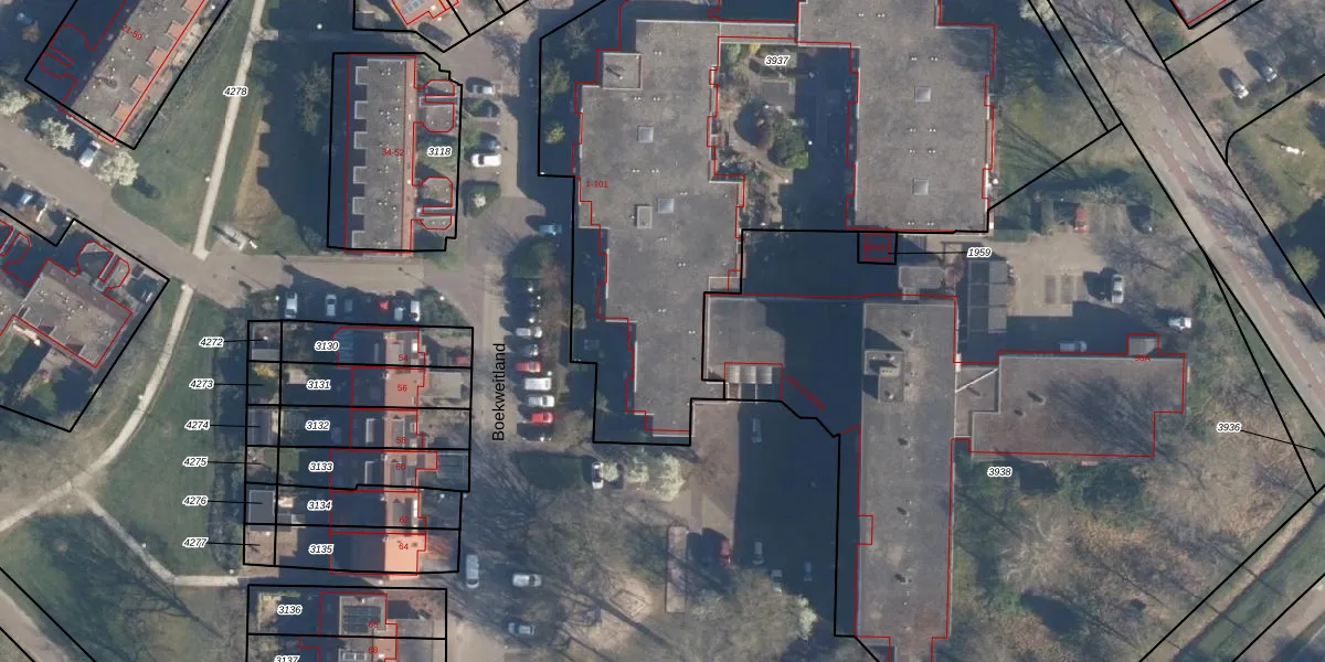 Het perceel waarop Boekweitland 55 staat heeft een oppervlakte van 4295 m². Dit is een zeer groot perceel. De perceeloppervlakte wordt geregistreerd door het Kadaster. Gedetailleerde informatie over de maten van dit perceel kunt u vinden in het rapport Kadastrale kaart met maatvoering van Boekweitland 55.