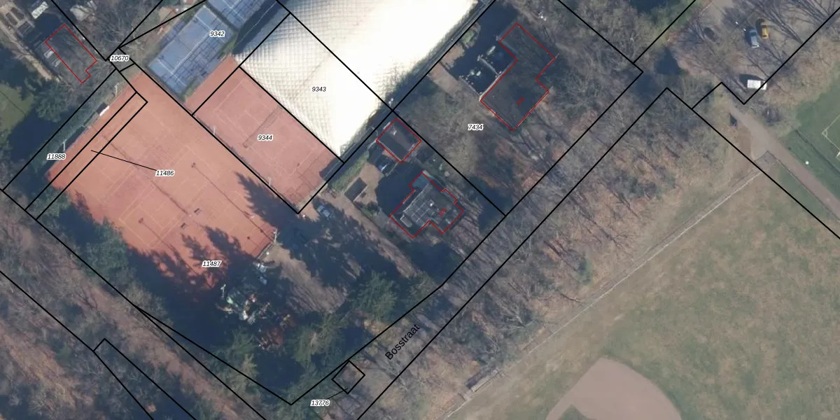Het perceel waarop Bosstraat 106 staat heeft een oppervlakte van 4402 m². Dit is een zeer groot perceel. De perceeloppervlakte wordt geregistreerd door het Kadaster. Gedetailleerde informatie over de maten van dit perceel kunt u vinden in het rapport Kadastrale kaart met maatvoering van Bosstraat 106.