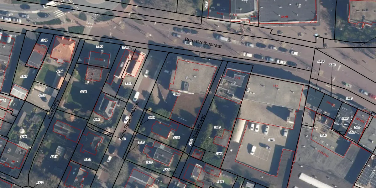 Het perceel waarop Burg Grothestraat 9-D staat heeft een oppervlakte van 1020 m². Dit is een zeer groot perceel. De perceeloppervlakte wordt geregistreerd door het Kadaster. Gedetailleerde informatie over de maten van dit perceel kunt u vinden in het rapport Kadastrale kaart met maatvoering van Burg Grothestraat 9-D.
