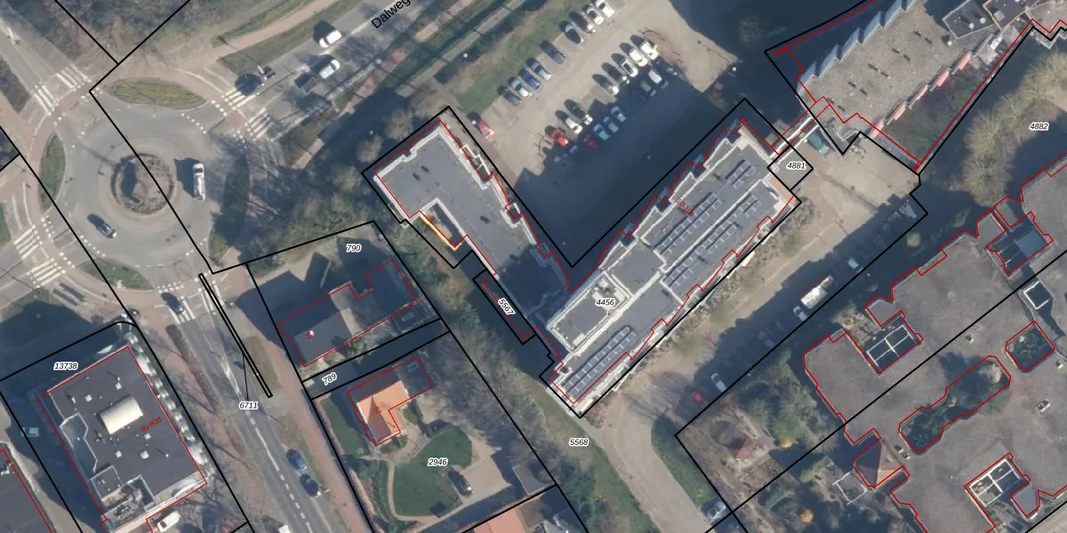 Het perceel waarop Dalplein 28 staat heeft een oppervlakte van 1920 m². Dit is een zeer groot perceel. De perceeloppervlakte wordt geregistreerd door het Kadaster. Gedetailleerde informatie over de maten van dit perceel kunt u vinden in het rapport Kadastrale kaart met maatvoering van Dalplein 28.