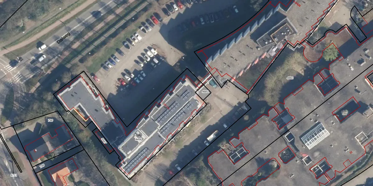 Het perceel waarop Dalplein 36 staat heeft een oppervlakte van 1920 m². Dit is een zeer groot perceel. De perceeloppervlakte wordt geregistreerd door het Kadaster. Gedetailleerde informatie over de maten van dit perceel kunt u vinden in het rapport Kadastrale kaart met maatvoering van Dalplein 36.