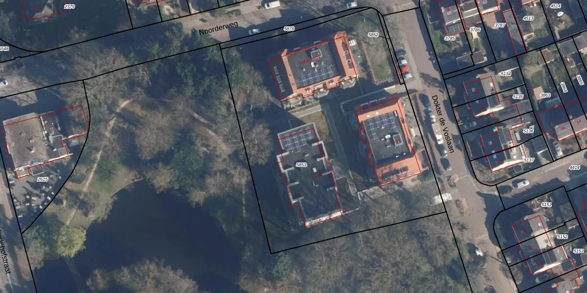 Het perceel waarop Dokter de Voslaan 37 staat heeft een oppervlakte van 4263 m². Dit is een zeer groot perceel. De perceeloppervlakte wordt geregistreerd door het Kadaster. Gedetailleerde informatie over de maten van dit perceel kunt u vinden in het rapport Kadastrale kaart met maatvoering van Dokter de Voslaan 37.