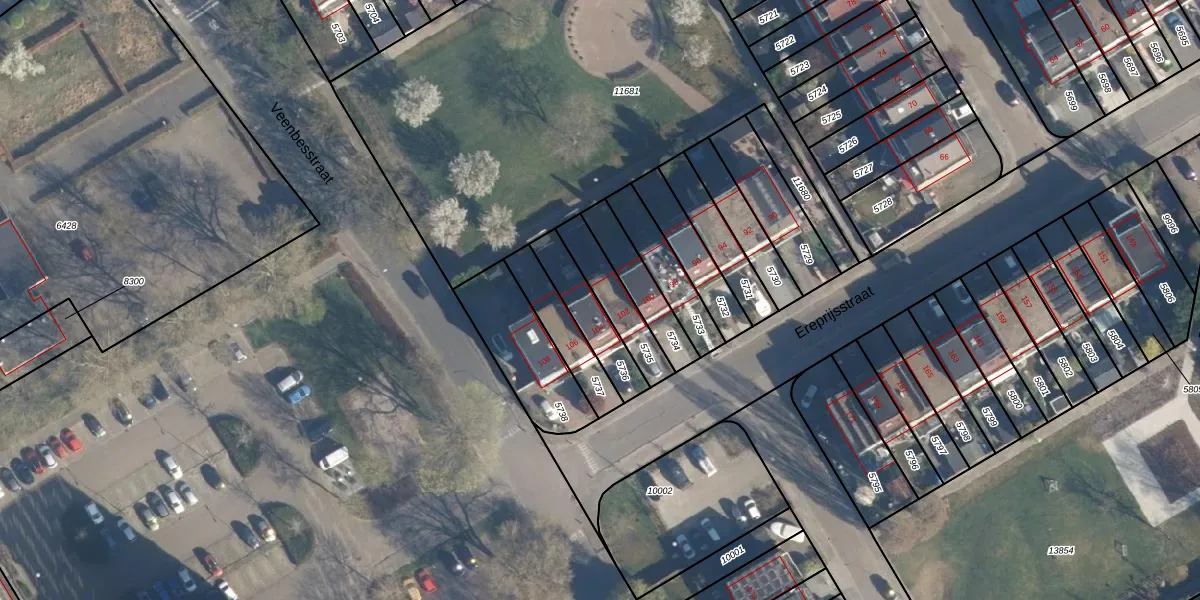 Het perceel waarop Ereprijsstraat 102 staat heeft een oppervlakte van 155 m². Dit is een middelgroot perceel. De perceeloppervlakte wordt geregistreerd door het Kadaster. Gedetailleerde informatie over de maten van dit perceel kunt u vinden in het rapport Kadastrale kaart met maatvoering van Ereprijsstraat 102.
