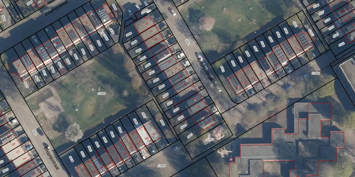 Het perceel waarop Ereprijsstraat 45 staat heeft een oppervlakte van 135 m². Dit is een middelgroot perceel. De perceeloppervlakte wordt geregistreerd door het Kadaster. Gedetailleerde informatie over de maten van dit perceel kunt u vinden in het rapport Kadastrale kaart met maatvoering van Ereprijsstraat 45.
