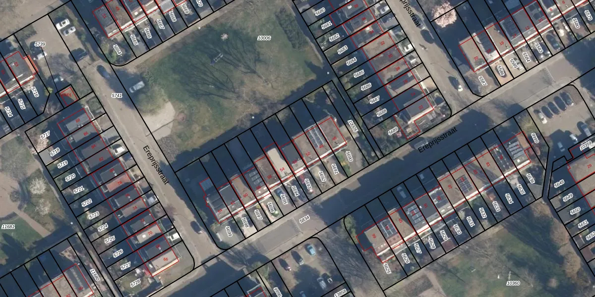 Het perceel waarop Ereprijsstraat 50 staat heeft een oppervlakte van 154 m². Dit is een middelgroot perceel. De perceeloppervlakte wordt geregistreerd door het Kadaster. Gedetailleerde informatie over de maten van dit perceel kunt u vinden in het rapport Kadastrale kaart met maatvoering van Ereprijsstraat 50.