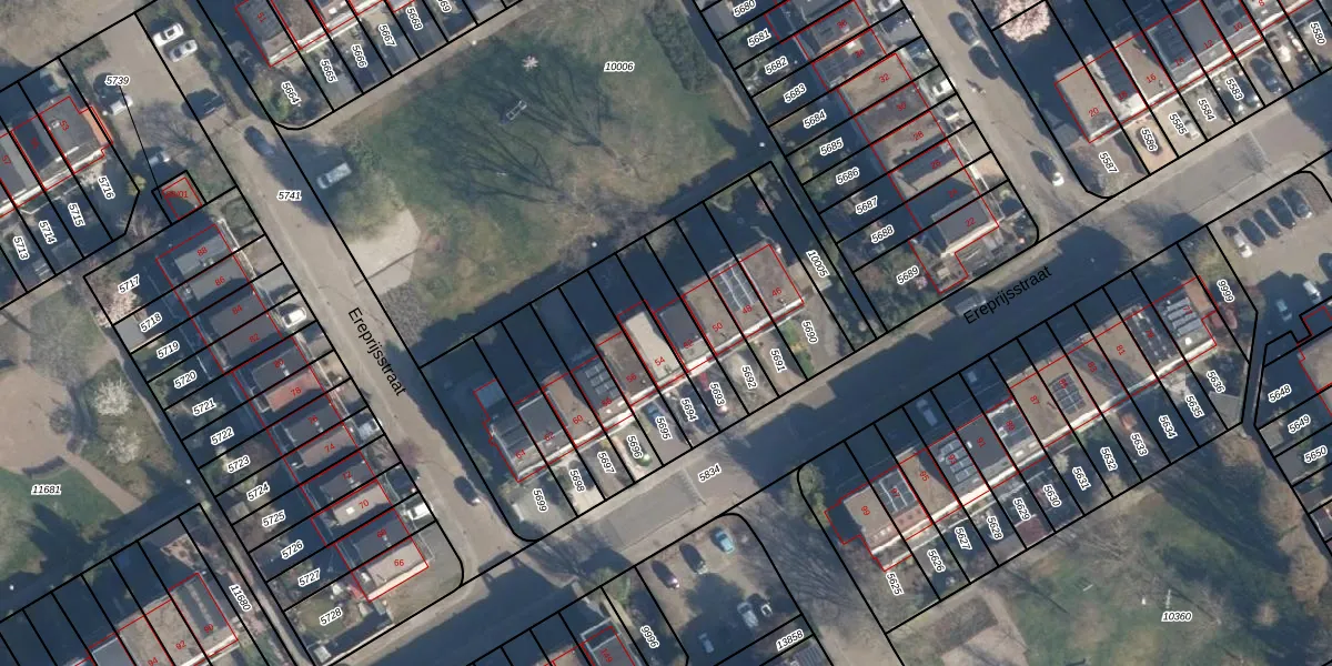 Het perceel waarop Ereprijsstraat 52 staat heeft een oppervlakte van 155 m². Dit is een middelgroot perceel. De perceeloppervlakte wordt geregistreerd door het Kadaster. Gedetailleerde informatie over de maten van dit perceel kunt u vinden in het rapport Kadastrale kaart met maatvoering van Ereprijsstraat 52.