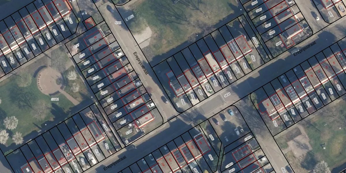 Het perceel waarop Ereprijsstraat 64 staat heeft een oppervlakte van 283 m². Dit is een middelgroot perceel. De perceeloppervlakte wordt geregistreerd door het Kadaster. Gedetailleerde informatie over de maten van dit perceel kunt u vinden in het rapport Kadastrale kaart met maatvoering van Ereprijsstraat 64.