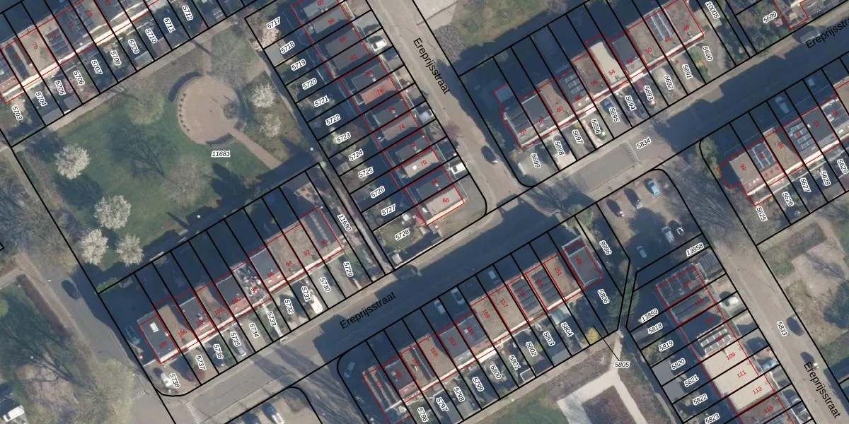 Het perceel waarop Ereprijsstraat 66 staat heeft een oppervlakte van 273 m². Dit is een middelgroot perceel. De perceeloppervlakte wordt geregistreerd door het Kadaster. Gedetailleerde informatie over de maten van dit perceel kunt u vinden in het rapport Kadastrale kaart met maatvoering van Ereprijsstraat 66.