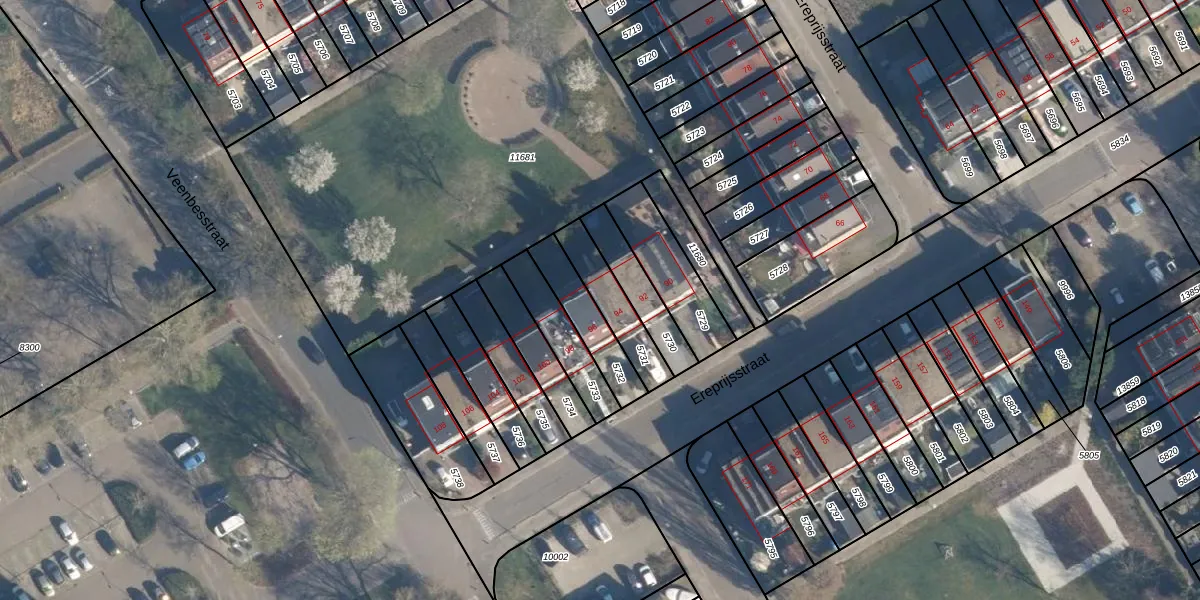 Het perceel waarop Ereprijsstraat 94 staat heeft een oppervlakte van 155 m². Dit is een middelgroot perceel. De perceeloppervlakte wordt geregistreerd door het Kadaster. Gedetailleerde informatie over de maten van dit perceel kunt u vinden in het rapport Kadastrale kaart met maatvoering van Ereprijsstraat 94.