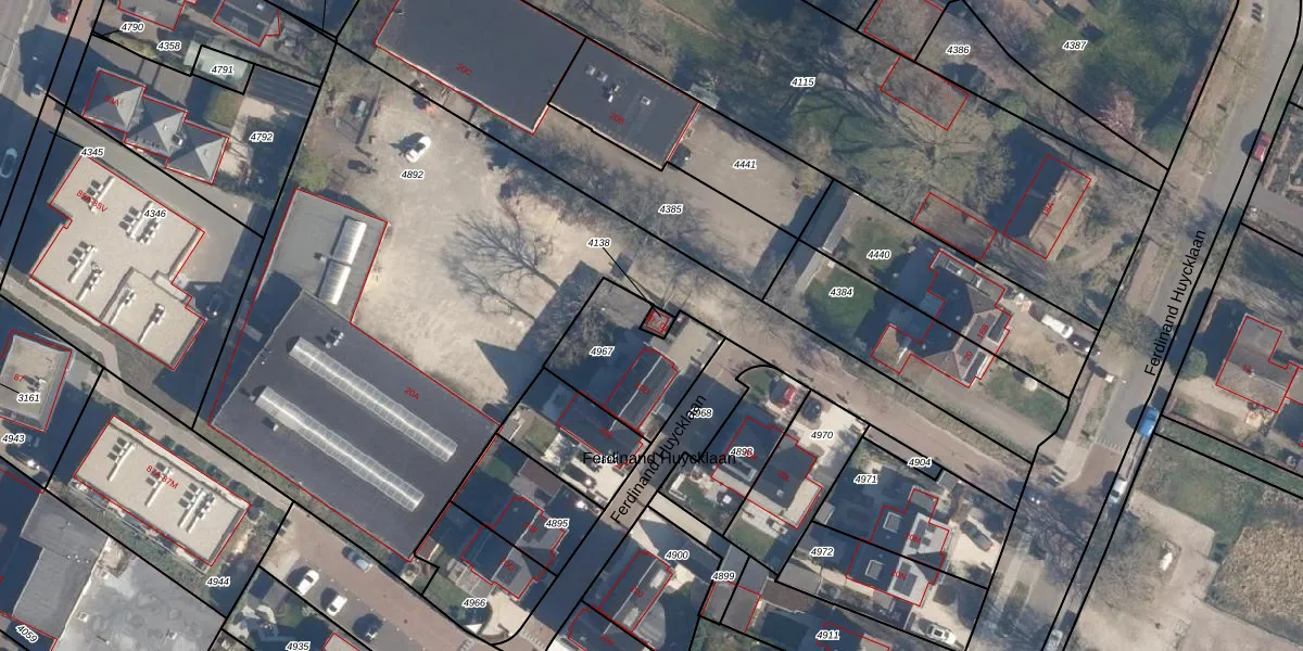Het perceel waarop Ferdinand Huycklaan 20-01 staat heeft een oppervlakte van 16 m². Dit is een klein perceel. De perceeloppervlakte wordt geregistreerd door het Kadaster. Gedetailleerde informatie over de maten van dit perceel kunt u vinden in het rapport Kadastrale kaart met maatvoering van Ferdinand Huycklaan 20-01.