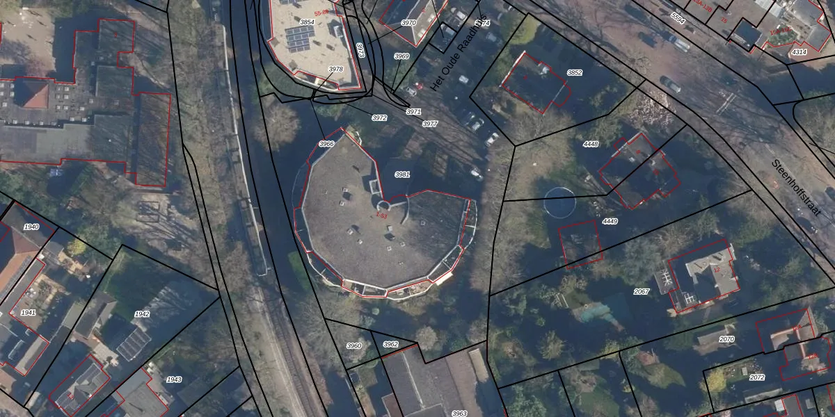 Het perceel waarop Het Oude Raadhuis 1 staat heeft een oppervlakte van 3240 m². Dit is een zeer groot perceel. De perceeloppervlakte wordt geregistreerd door het Kadaster. Gedetailleerde informatie over de maten van dit perceel kunt u vinden in het rapport Kadastrale kaart met maatvoering van Het Oude Raadhuis 1.