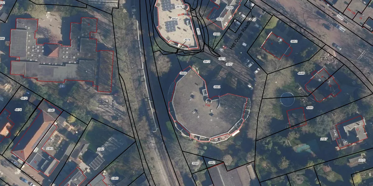 Het perceel waarop Het Oude Raadhuis 33 staat heeft een oppervlakte van 3240 m². Dit is een zeer groot perceel. De perceeloppervlakte wordt geregistreerd door het Kadaster. Gedetailleerde informatie over de maten van dit perceel kunt u vinden in het rapport Kadastrale kaart met maatvoering van Het Oude Raadhuis 33.
