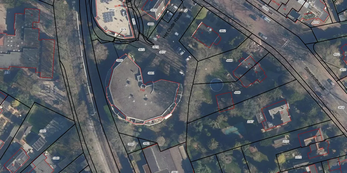 Het perceel waarop Het Oude Raadhuis 37 staat heeft een oppervlakte van 3240 m². Dit is een zeer groot perceel. De perceeloppervlakte wordt geregistreerd door het Kadaster. Gedetailleerde informatie over de maten van dit perceel kunt u vinden in het rapport Kadastrale kaart met maatvoering van Het Oude Raadhuis 37.