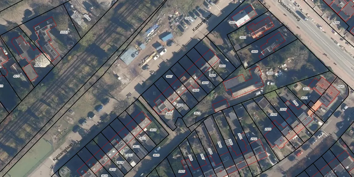 Kastanjelaan 9 is gelegen op kadastraal perceel SOE00D3607. Deze kadastrale aanduiding is uniek en wordt gebruikt door het Kadaster om eigendomsrechten en andere zakelijke rechten vast te leggen. Het perceel maakt onderdeel uit van de kadastrale gemeente Soest.