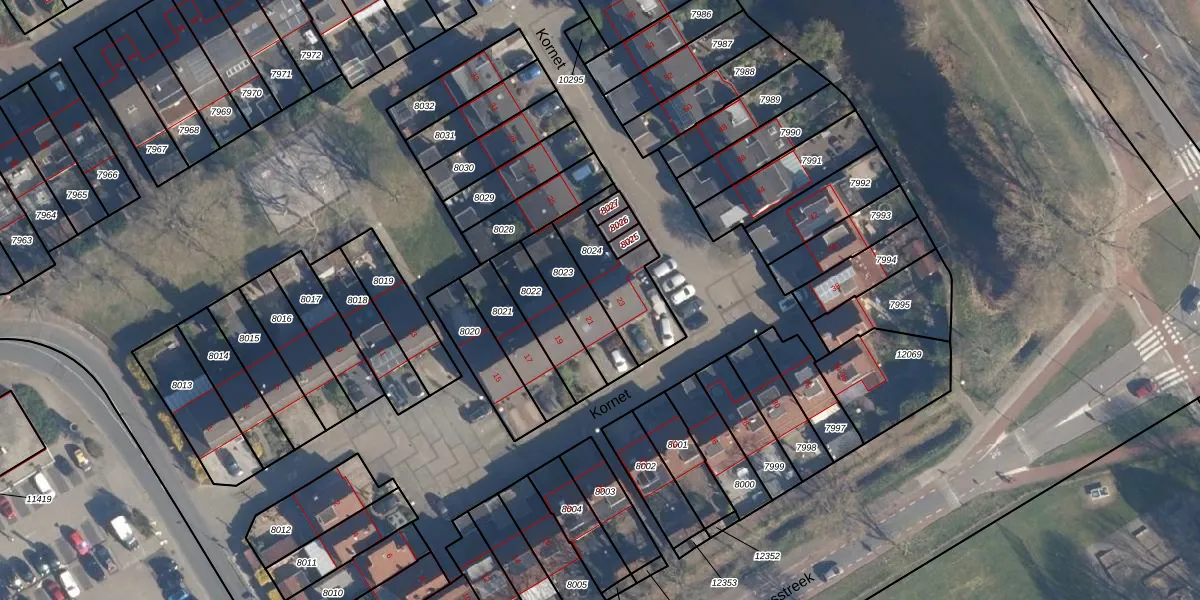 Het perceel waarop Kornet 23 staat heeft een oppervlakte van 245 m². Dit is een middelgroot perceel. De perceeloppervlakte wordt geregistreerd door het Kadaster. Gedetailleerde informatie over de maten van dit perceel kunt u vinden in het rapport Kadastrale kaart met maatvoering van Kornet 23.
