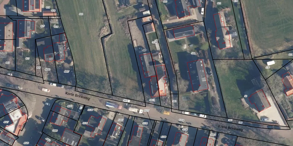 Het perceel waarop Korte Brinkweg 57-A staat heeft een oppervlakte van 655 m². Dit is een groot perceel. De perceeloppervlakte wordt geregistreerd door het Kadaster. Gedetailleerde informatie over de maten van dit perceel kunt u vinden in het rapport Kadastrale kaart met maatvoering van Korte Brinkweg 57-A.