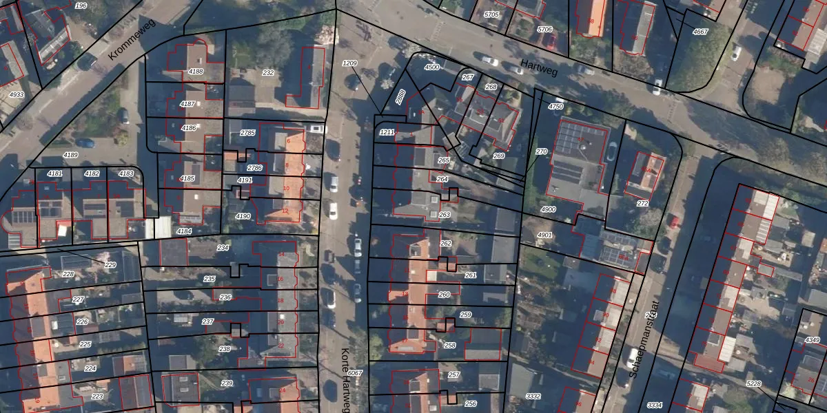 Het perceel waarop Korte Hartweg 7 staat heeft een oppervlakte van 285 m². Dit is een middelgroot perceel. De perceeloppervlakte wordt geregistreerd door het Kadaster. Gedetailleerde informatie over de maten van dit perceel kunt u vinden in het rapport Kadastrale kaart met maatvoering van Korte Hartweg 7.