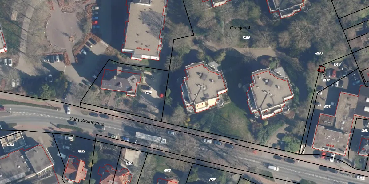 Het perceel waarop Oranjehof 14 staat heeft een oppervlakte van 8608 m². Dit is een zeer groot perceel. De perceeloppervlakte wordt geregistreerd door het Kadaster. Gedetailleerde informatie over de maten van dit perceel kunt u vinden in het rapport Kadastrale kaart met maatvoering van Oranjehof 14.