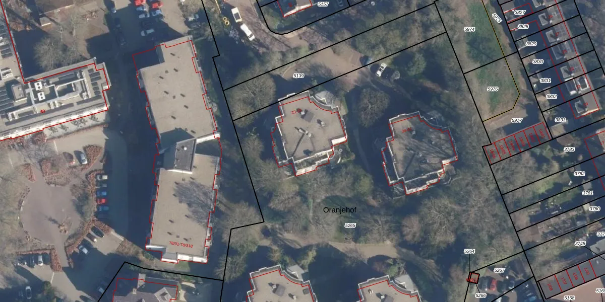 Het perceel waarop Oranjehof 30 staat heeft een oppervlakte van 8608 m². Dit is een zeer groot perceel. De perceeloppervlakte wordt geregistreerd door het Kadaster. Gedetailleerde informatie over de maten van dit perceel kunt u vinden in het rapport Kadastrale kaart met maatvoering van Oranjehof 30.