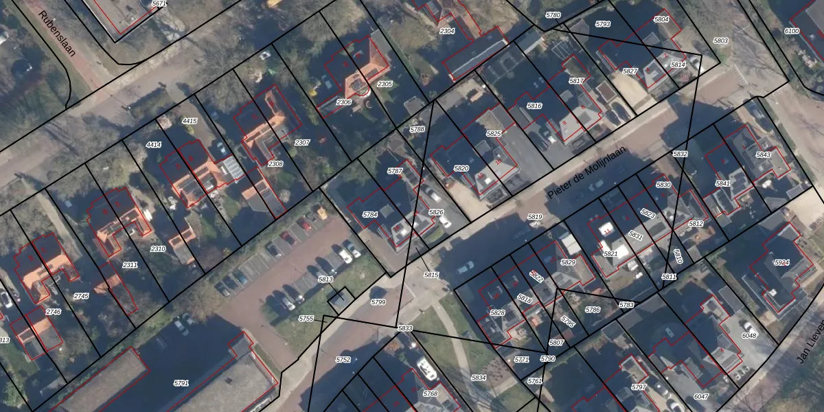 Pieter de Molijnlaan 14 is gelegen op kadastraal perceel SOE00K5787. Deze kadastrale aanduiding is uniek en wordt gebruikt door het Kadaster om eigendomsrechten en andere zakelijke rechten vast te leggen. Het perceel maakt onderdeel uit van de kadastrale gemeente Soest.