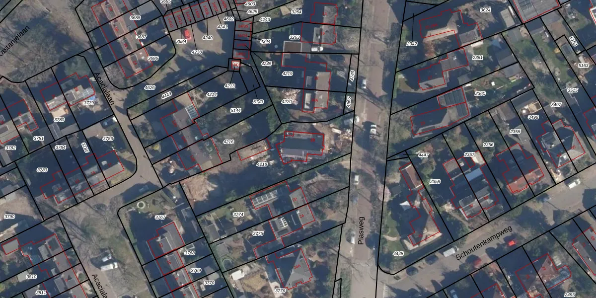 Het perceel waarop Plasweg 20 staat heeft een oppervlakte van 863 m². Dit is een groot perceel. De perceeloppervlakte wordt geregistreerd door het Kadaster. Gedetailleerde informatie over de maten van dit perceel kunt u vinden in het rapport Kadastrale kaart met maatvoering van Plasweg 20.