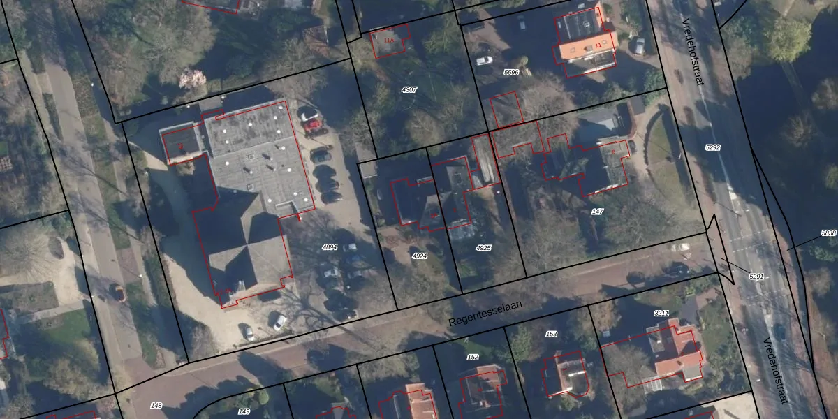 Het perceel waarop Regentesselaan 2-A staat heeft een oppervlakte van 592 m². Dit is een groot perceel. De perceeloppervlakte wordt geregistreerd door het Kadaster. Gedetailleerde informatie over de maten van dit perceel kunt u vinden in het rapport Kadastrale kaart met maatvoering van Regentesselaan 2-A.