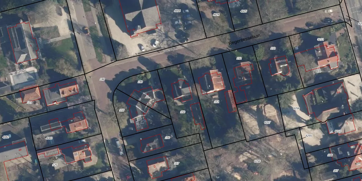 Regentesselaan 7 is gelegen op kadastraal perceel SOE00K150. Deze kadastrale aanduiding is uniek en wordt gebruikt door het Kadaster om eigendomsrechten en andere zakelijke rechten vast te leggen. Het perceel maakt onderdeel uit van de kadastrale gemeente Soest.